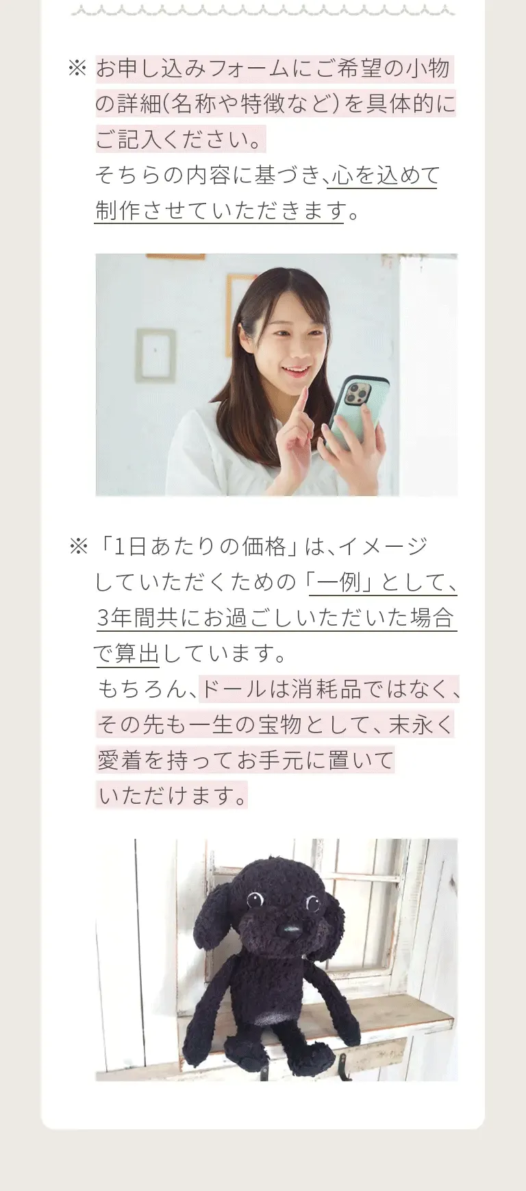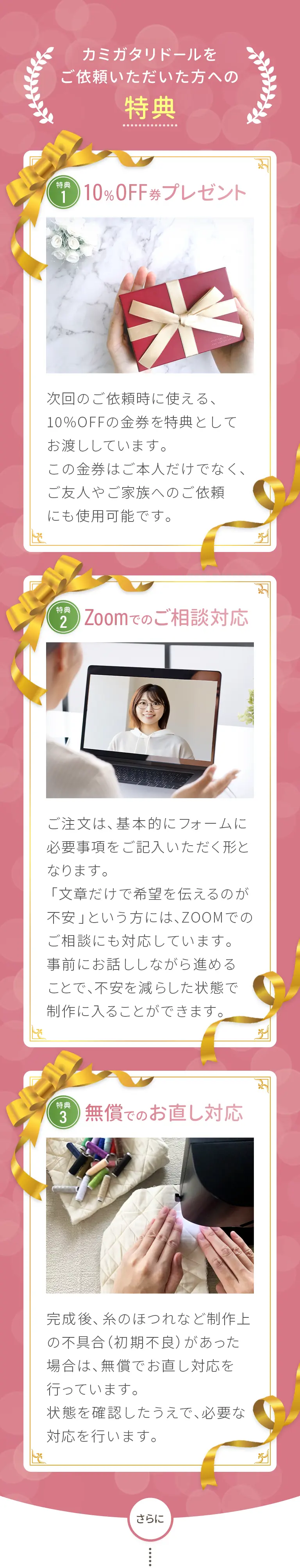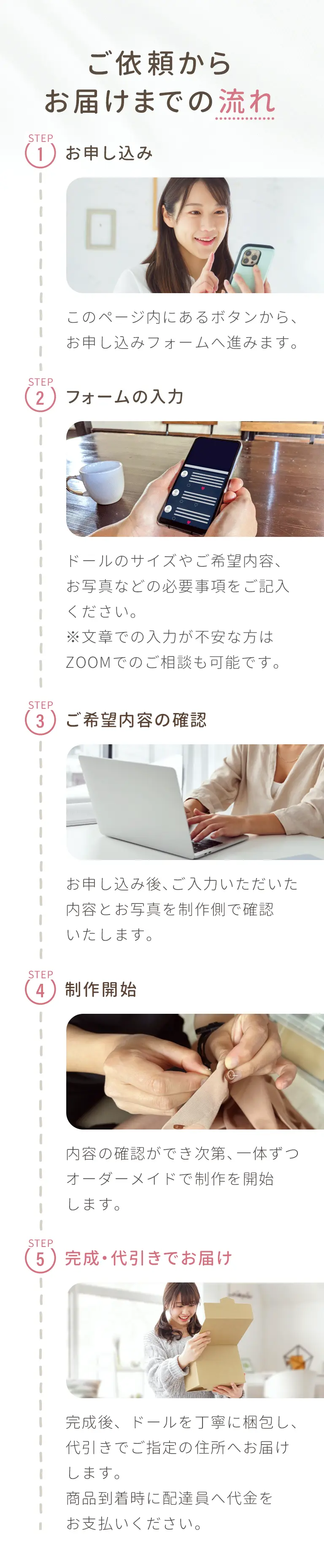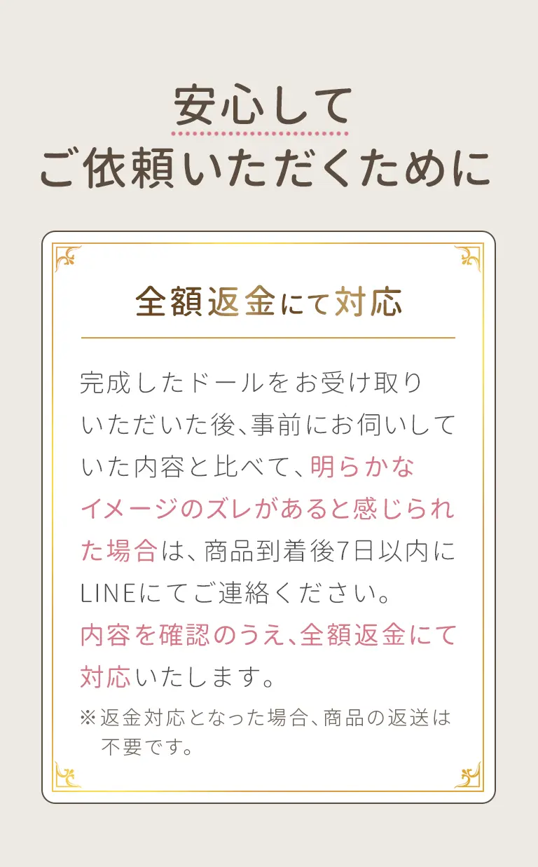 完成したドールをお受け取りいただいた後、 事前にお伺いしていた内容と比べて、明らかなイメージのズレがあると感じられた場合は、商品到着後7日以内にLINEにてご連絡ください。 内容を確認のうえ、全額返金にて対応いたします。※返金対応となった場合、商品の返送は不要です。