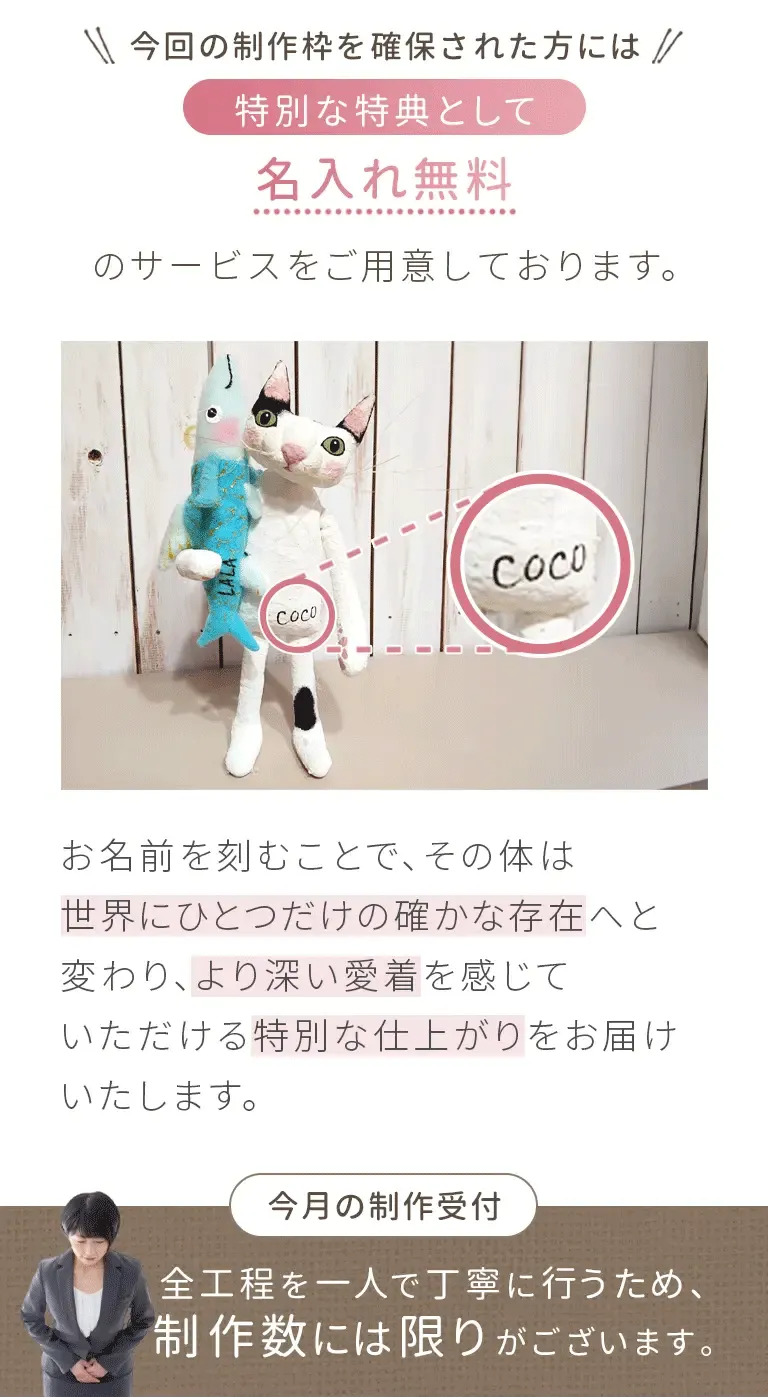 名入れ、毛入れ、小物などのこだわり製作可能。